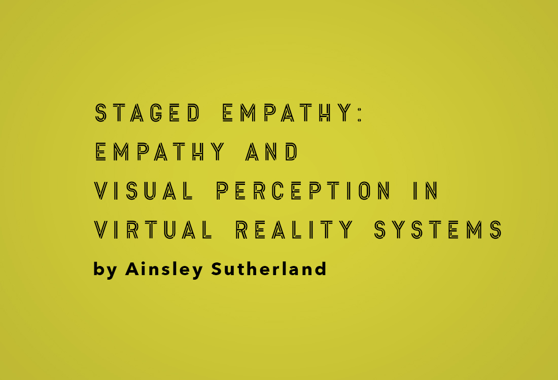 By Ainsley Sutherland. Abstract This thesis proposes staged empathy as a new analytical framework to examine how virtual reality work provokes empathic feeling. Virtual reality has seen renewed interest in recent years,...